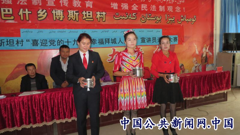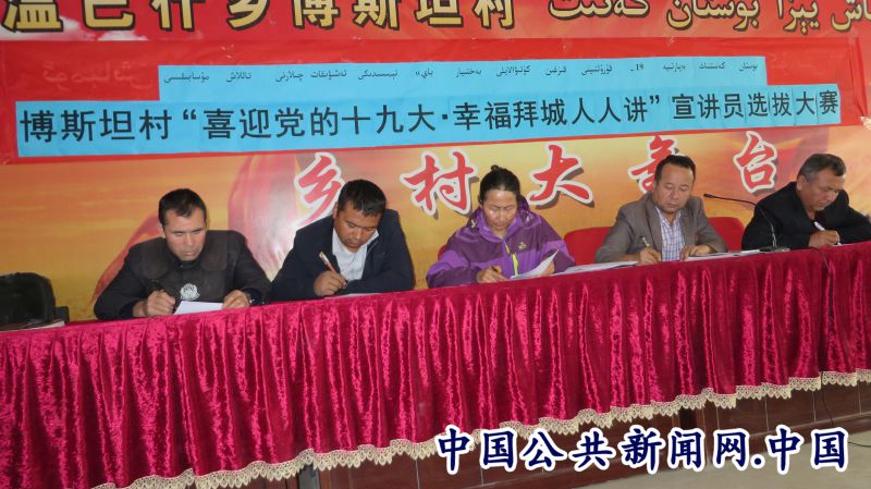 全民公众讯(张新萍)为了迎接党的十九大胜利召开,扎实开展群众宣传工作,大力培养一支政治坚定、敢讲会讲、贴近群众的优秀草根宣讲员队伍。2017年9月27日上午,供销社驻温巴什乡博斯坦村工作队协助村委会在博斯坦村村民活动室举办了“喜迎党的十九大•幸福拜城人人讲”草根宣讲员选拔大赛,由村委会和各小队推荐的10名选手参加了比赛,400多名村民参加了活动。