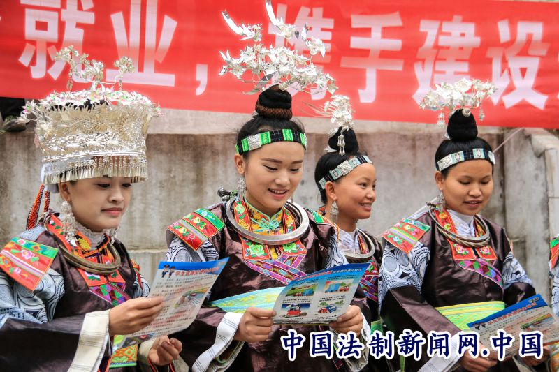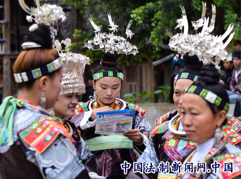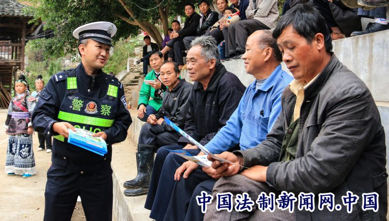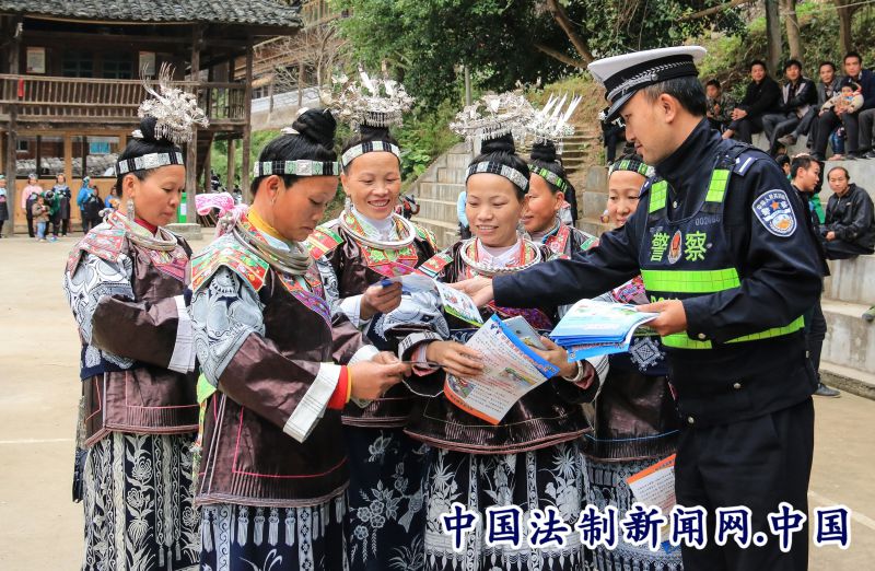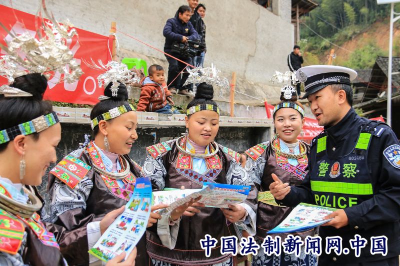 宣传民警向身着盛装的苗族群众发放宣传资料。陆德华 摄