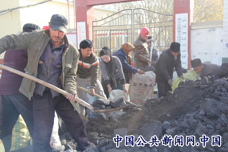 全民公众讯(王瑞)11月17日,阔纳艾日克村村委会门前热闹非凡,阿克苏市文广局驻拜什吐格曼乡阔纳克艾日克村驻村工作队为困难群众准备的冬季取暖煤,正在免费发放。