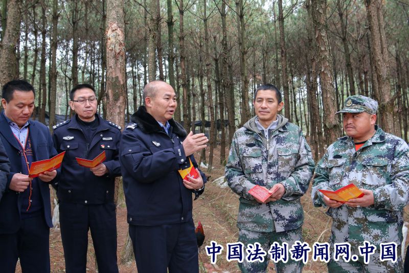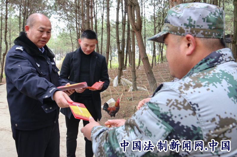 支队长梁吉钢在产业基地向农户发放十九大精神宣传册。(陆德华 摄)