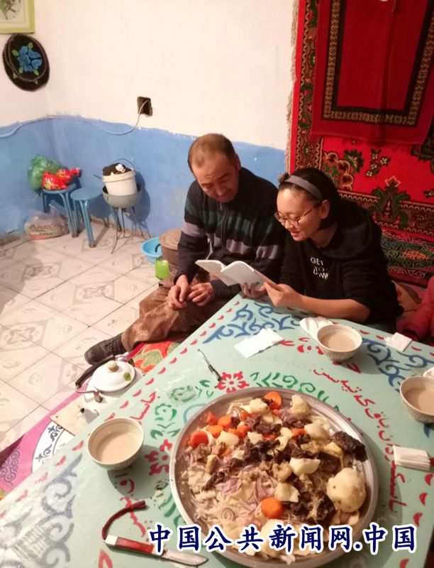 晚上,大哥说大嫂做了他们哈萨克族的特色美食“那仁”。我们一起盘腿坐在榻榻米上,用手抓着肉吃,其乐融融。饭桌上我们共同谈起“十九大”这个话题,大哥聊起他们曾经跟现在生活的差距,大哥说:“现在党的政策真是好,而且我相信会越来越好的。”我看到大哥笔记本上用汉语赫然写着“听党话,感党恩,听党指挥。”