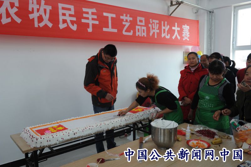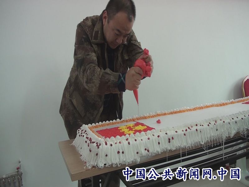 而活动大厅一角,一块长1.8米、宽60厘米的大蛋糕,正在蛋糕师的手下一点点完成,两面鲜艳的五星红旗和“不忘初心 牢记使命”及“民族团结一家亲”几个鲜红的大字,在白色的蛋糕上显得非常醒目,在围观群众的注视下,随着蛋糕师将鲜红的石榴籽均匀地洒满整个蛋糕周边后,这块巨型的大蛋糕大功告成。