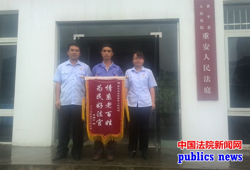 公众全民讯(潘钊)“我就是一个老百姓,在这里感谢黄平法院重安法庭的法官们,要不是你们尽心尽责,我这800元就要不回来了,你们为我伸张了正义,维护我的权益,我送你们一面锦旗,以表示我一点小小的心意。”5月22日是下雨天,光线很暗,而上午八点还没到,家住重安镇某偏远山村的周某拿着一面写有“为民好法官,情系老百姓”的锦旗早早就来到黄平县法院重安人民法庭的诉讼服务中心大厅内坐起,一看见办案法官就紧握着法官的手颤抖着,不停地说着感谢的话。