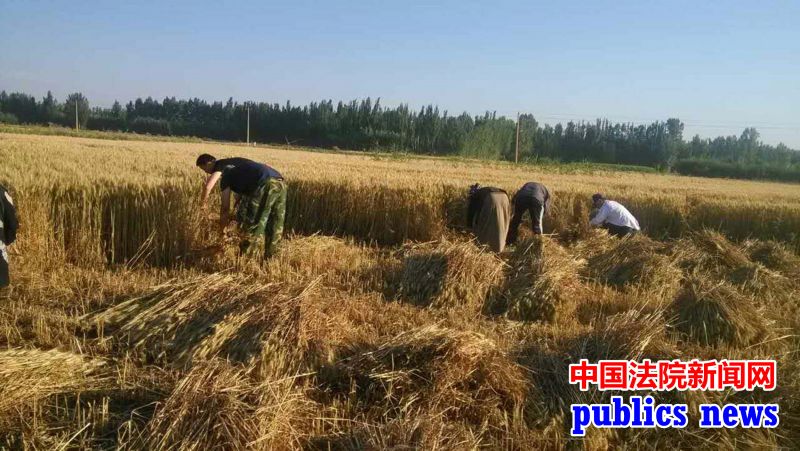 公众全民讯(梁晶晶)2015年6月14日一早,喀什中院第八党支部(政治部)全体党员来到结对子对象胡达拜尔迪家的麦田,在农忙季节帮助其割麦子。